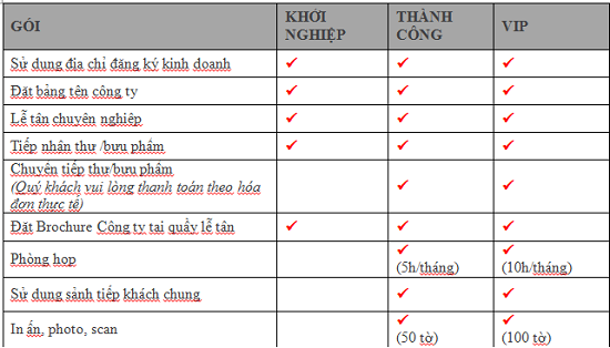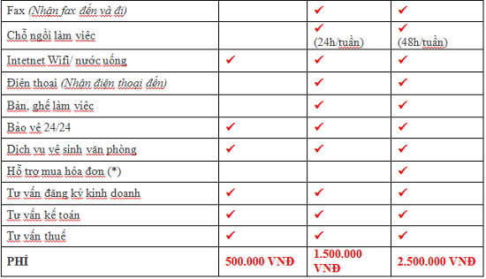 (Virtual Office): Với mức phí chỉ khoảng 300.000 vnđ/tháng (*), Bạn có thể sử dụng địa chỉ của dịch vụ văn phòng ảo hà nội chia sẻ của HONG DUC OFFICE để thực hiện các giao dịch như đăng ký thành lập công ty, văn phòng đại diện, chi nhánh, in danh thiếp; nhận và gửi Fax, thư từ, bưu phẩm, sử dụng phòng họp tiêu chuẩn, lễ tân/tiếp khách và nhiều tiện ích khác.