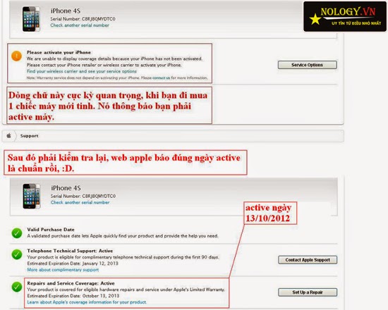 + Nếu máy đã active( đã có người dùng rồi và không còn mới nữa) bạn sẽ thấy như hình , ở đây bạn có thể biết được máy mình active từ ngày nào và ngày hết bảo hành apple .