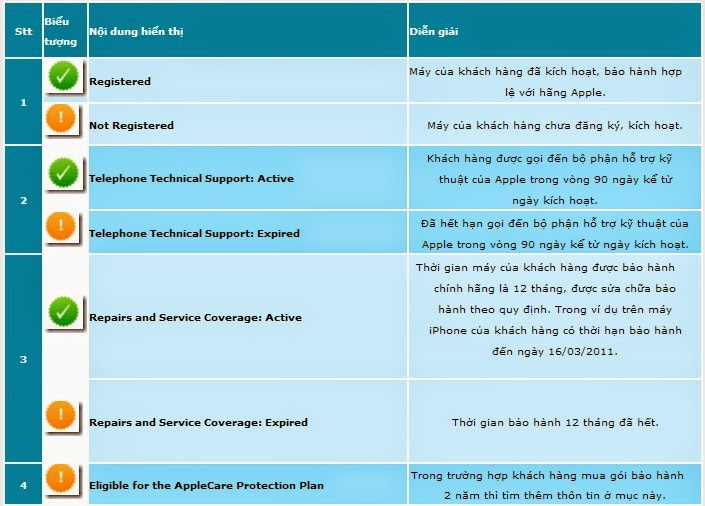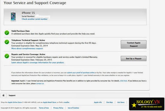 Trước mắt bạn sẽ là một màn hình cho biết thông tin chi tiết về tình trạng bảo hành của máy Iphone 5s, kể cả thời gian còn lại, hỗ trợ qua điện thoại, bạn đủ điều kiện để sửa chữa phục hồi hay không, và bạn đủ điều kiện để gia hạn bảo hành hay không.