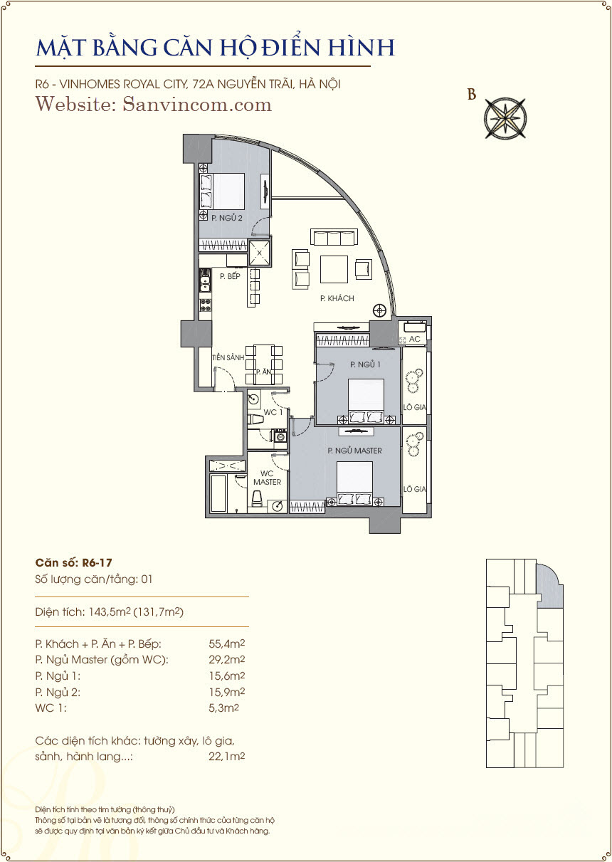 - Thiết kế 3 phòng ngủ với căn diện tích 103m2 có vườn treo thông tầng ngay lối vào căn hộ. Căn diện tích 115m2 là căn góc của toà R6 với 2 ban công, view rộng