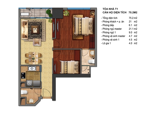 Thiết kế vuông vắn gồm 02 ngủ, 02 phụ, 01 khách+bếp+logia