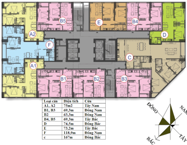 Diện tích căn hộ: từ 63,3 - 69,3 - 72,3 - 74,5 - 75- 118,9 - 167,6 m²