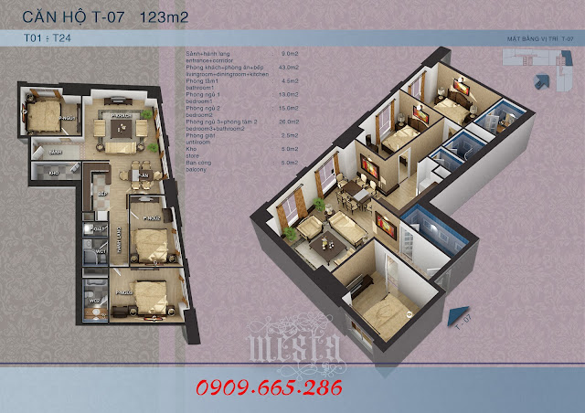 + Căn Hộ 123m2: Tây Nam ( Tây Bắc - Đông Bắc)
