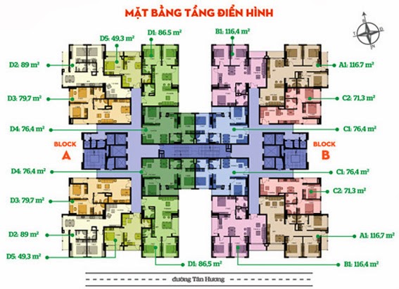 Diện tích: 49,3m2, 71,3m2, 76,4m2,79,7m2, 86,5m2, 89m2, 116,7m2.