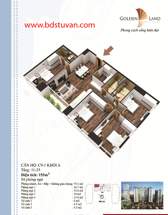 Khu căn hộ và nhà ở cao cấp được chia thành 3 tòa nhà chung nhau phần đế từ 3 tầng hầm đến tầng cao thứ 9. Đây là Tháp 3 đầu tiên tại Hà Nội gồm 2 block cao 25 tầng và 1 block cao 27 tầng, với hơn 500 căn hộ được chia thành 30 loại khác nhau có diện tích từ 73m2 cho đến 145m2.