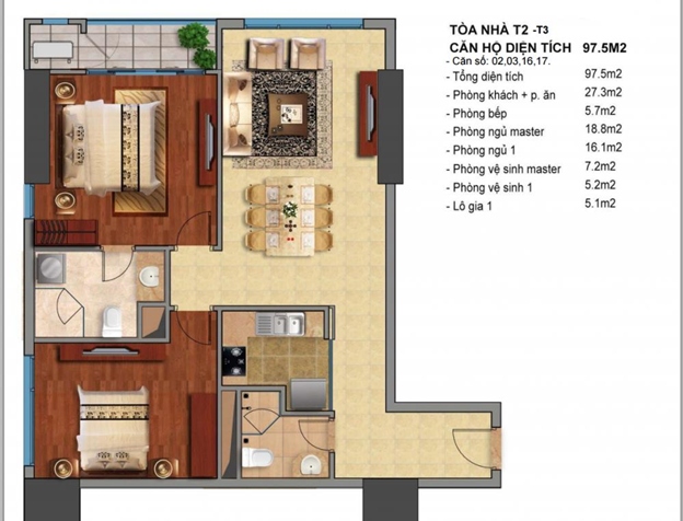 Căn hộ 2 phòng ngủ, 1 phòng khách, 2 phụ, 1 bếp, 1 logia