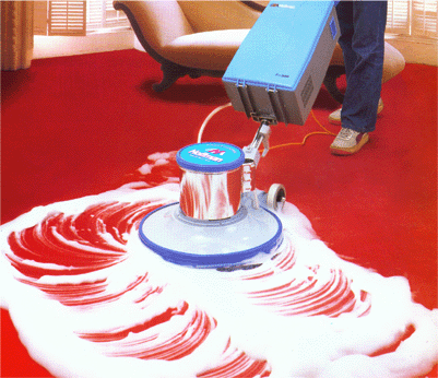 4. Tiến hàng phun hoá chất đều bề mặt thảm và đánh tan vết bẩn (chuỗi liên hợp thông qua máy chuyên dụng).