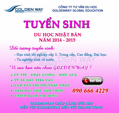 Công ty tư vấn du học Golden Way tuyển sinh kì nhập học tháng 4/2015. Bắt đầu nhận hồ sơ từ ngày 1.9.2014. Các bạn nhanh chóng đăng kí để nhận được nhiều ưu đãi nhé.