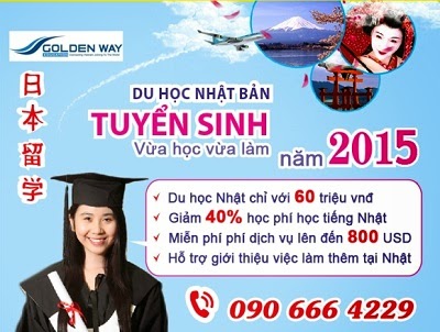 Công ty tư vấn du học GOLDEN WAY GLOBAL EDUCATION xin trân trọng thông báo đến toàn thể những ai yêu mến Nhật Ngữ, những ai mong ước được học tập và làm việc tại Nhật Bản.Kỳ nhập học tháng 04/2015 chính thức nhận hồ sơ đăng ký từ ngày 15/08/2014 cho đến ngày 15/11/2014. Ưu tiên ứng viên nộp hồ sơ sớm !