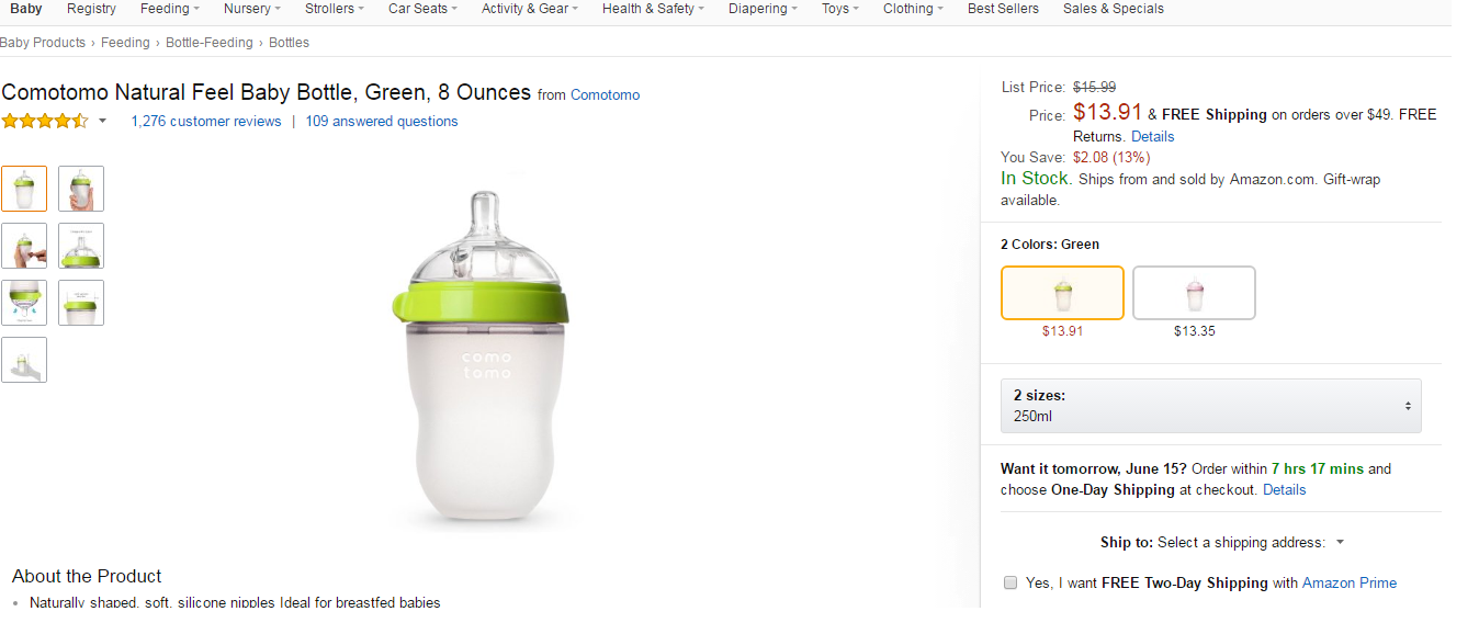Như các bạn đã biết, bình comotomo là sản phẩm của Mỹ và được sản xuất tại Hàn Quốc, nghĩa là nếu nó ở Việt Nam thì đây 100% là hàng nhập. Nếu các bạn tinh ý có thể lên trang bán hàng lớn nhất amazon để tìm kiếm và xác định giá sản phẩm. Hiện amazon đang bán bình sữa Comotomo giá rẻ với mức 14$/ bình, khoảng 290.000 vnd. Vì là hàng nhập nên nếu về Việt Nam, sản phẩm này sẽ phải có mức giá xấp xỉ như trên, ít nhất là bằng. Các bạn có thể dựa vào đây để so sánh mức giá bình sữa Comotomo trên thị trường. Chú ý, các mẹ không nên lựa chọn sản phẩm rẻ hơn quá nhiều vì bình sữa Comotomo giá rẻ đã có hàng nhái. Nếu mua nhầm hàng nhái sẽ rất nguy hiểm cho bé.