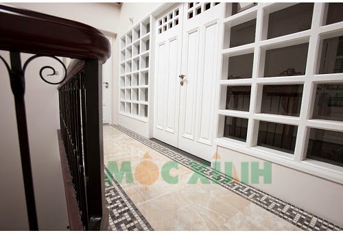 Các vòn cửa, cánh cửa sổ đều 2 lớp trong kính ngoài chớp, kết hợp giữa đặc và rỗng các màng rỗng cho ánh sáng luồn vào các mảng đặc dùng các chi tiết phào gỗ tạo thành khung và pano, tất cả mặt trong đều được sơn màu trắng.