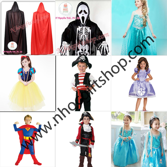 *** Trang phục Halloween: Áo choàng Dracula, Bộ đầm Công chúa Elsa, công chúa Sofia, Bộ Đầm Bạch Tuyết, Bộ đồ siêu nhân, Batman, bộ đồ cướp biển, Bộ đồ thần chết…