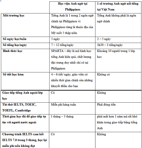 So sánh học tiếng Anh tại Philippines và 1 số trường nổi tiếng tại Việt Nam: