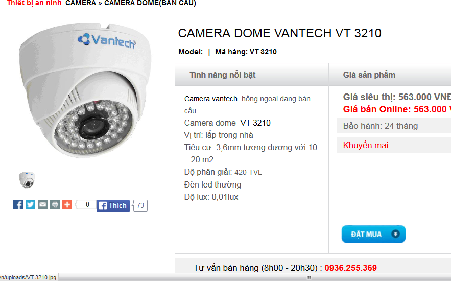 3. CAMERA QUAN SÁT DOME VANTECH VT 3210 hồng ngoại dạng bán cầu• Cảm biến 1/4” SONY Color CCD• Độ phân giải 420 TVL (Color)/ 480 TVL (B/W)• Độ nhạy sáng: 0.5 Lux /F1.2 (0.0 Lux IR On)• Auto AGC, BLC, ...• Hồng ngoại 12 pcs High Power LEDs / 36 pcs Ø5• Ống kính tiêu cự cố định f=3.6mm/F1.2• Nguồn : DC 12V ± 10% 1000mA(không kèm bộ đổi nguồn)