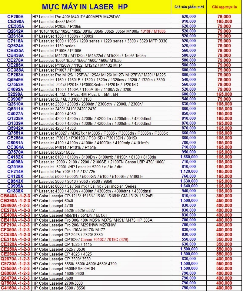 Bảng báo giá dịch vụ nạp mực in và hộp mực in tương thích giá siêu rẻ