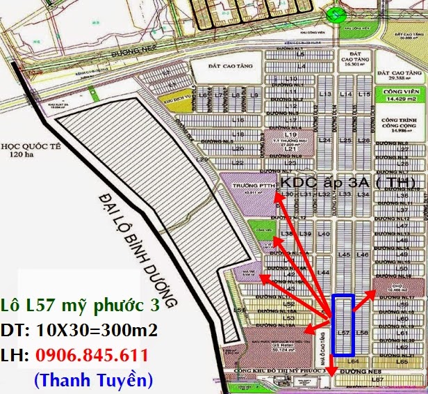 - Lô L57 đất Mỹ Phước 3 có vị trí cực kỳ đắc địa, nằm sát đường NE8-trục đường chính của KĐT Mỹ Phước 3. Lô L57 đất bình dương nằm trên mặt tiền đường nhựa DL14 (25m), song song với trục đường chính, nối liền các tuyến giao thông quan trọng như QL13, Cao tốc Tân Vạn Mỹ Phước đi về TP HCM và thông thẳng qua trung tâm TP Mới Bình Dương.