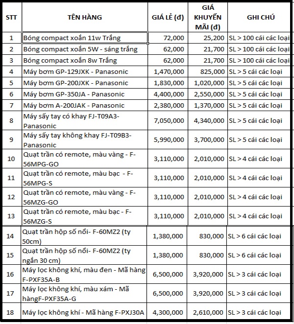 khuyến mãi lên đến 50%. Các loại hàng khuyến mãi như: Bóng đèn compact, máy bơm, mấy sấy tay, quạt trần, máy lọc không khí....