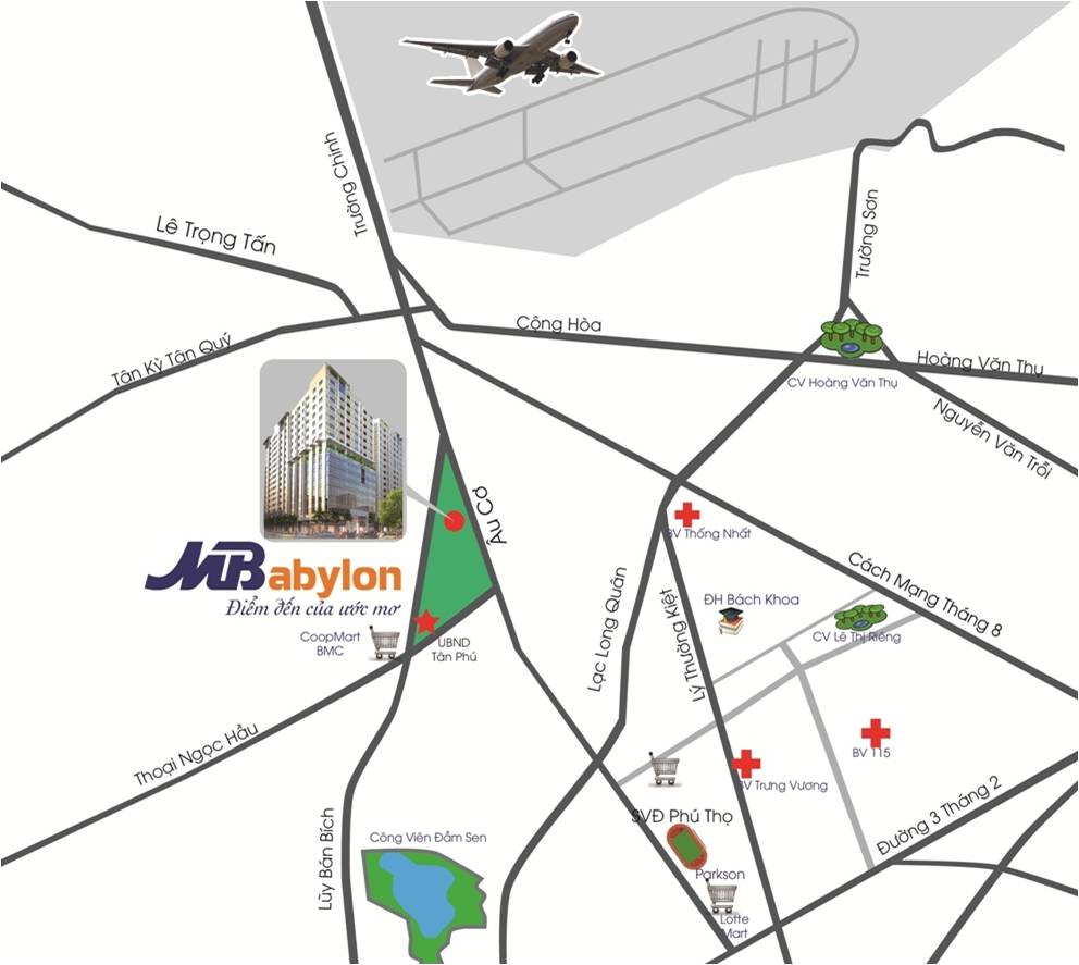 Babylon : sở hữu mặt tiền trên 70m đường Âu Cơ, trục đường huyết mạch của Quận Tân Bình và Tân Phú với lộ giới dự phóng 30m. Cao ốc nằm ở Trung Tâm hành chính Quận Tân Phú gần các công trình phục vụ dân sinh như Bệnh viện Thống Nhất, Chợ Bàu Cát, Co- OpMart Lũy Bán Bích, sân bay Quốc tế Tân Sơn Nhất, Khu du lịch Đầm Sen, Trung tâm Thể thao Đa năng Phú Thọ, trường Đại học Bách Khoa TP. Hồ Chí Minh…