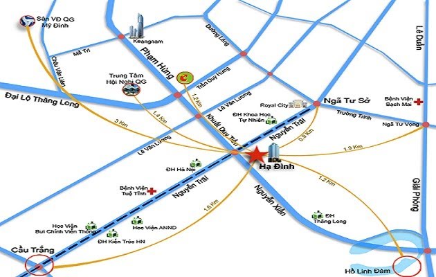 Dự án chung cư hạ đình nằm gần điểm giao cắt của đường vành đai 3, do vậy việc đi tới trung tâm Hội Nghị Quốc gia, Sân Bay Nội Bài, Sân Vân Động là rất dễ dàng