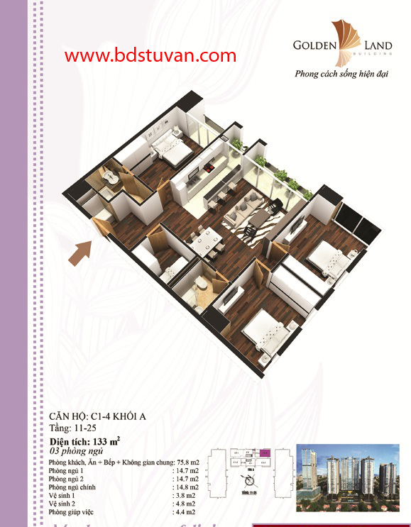 Khu căn hộ và nhà ở cao cấp được chia thành 3 tòa nhà chung nhau phần đế từ 3 tầng hầm đến tầng cao thứ 9. Đây là Tháp 3 đầu tiên tại Hà Nội gồm 2 block cao 25 tầng và 1 block cao 27 tầng, với hơn 500 căn hộ được chia thành 30 loại khác nhau có diện tích từ 73m2 cho đến 145m2.