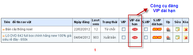 - Tại trang quản lý tin rao vặt của bạn, Quý khách thấy có nút tương ứng với cột “VIP dài hạn” ở mỗi tin rao vặt. Quý khách hãy kích chuột vào nút ở tin rao vặt mà mình muốn đăng dài hạn.