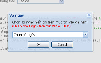 - Sau khi kích vào nút “VIP dài hạn” một màn hình mới được hiển thị cho phép bạn chọn số ngày bạn muốn tin rao vặt đó được hiển thị ở những vị trí đầu tiên trên mục tin VIP.