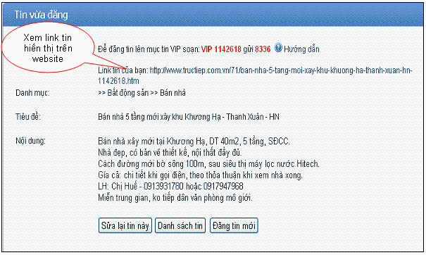 Tin đăng của bạn (cả tin VIP và tin thường) sẽ được hiển thị trên website trong thời gian 3 tháng kể từ ngày đăng tin. Sau thời gian này, tin của bạn sẽ bị xóa hoàn toàn khỏi tructiep.vn.