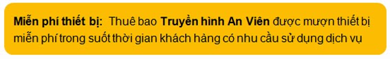 Truyền hình An Viên cho Quý khách hàng mượn bộ Thiết bị thu (01 Ăng ten hoặc Chảo thu; 01 bộ Đầu thu; 01 Thẻ giải mã và 01 bộ Điều khiển) trong vòng 18 tháng kể từ thời điểm lắp đặt. Từ tháng thứ 19 trở đi, Thiết bị thu thuộc quyền sở hữu của khách hàng.